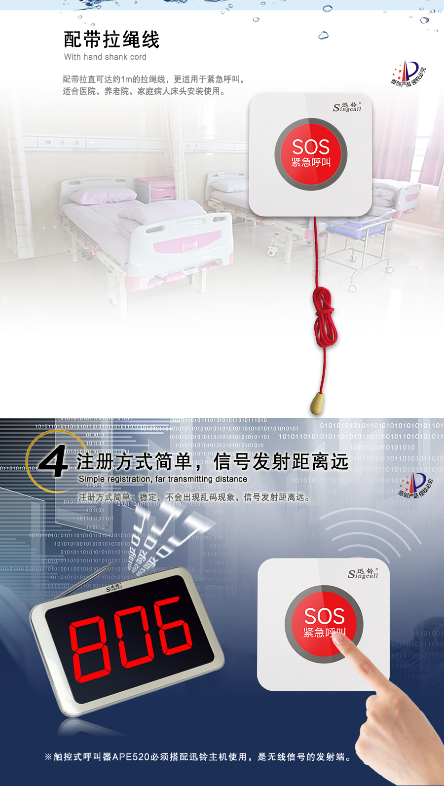 作用用途:醫(yī)院/診所等場(chǎng)所病患呼叫醫(yī)護(hù)人員的發(fā)射端