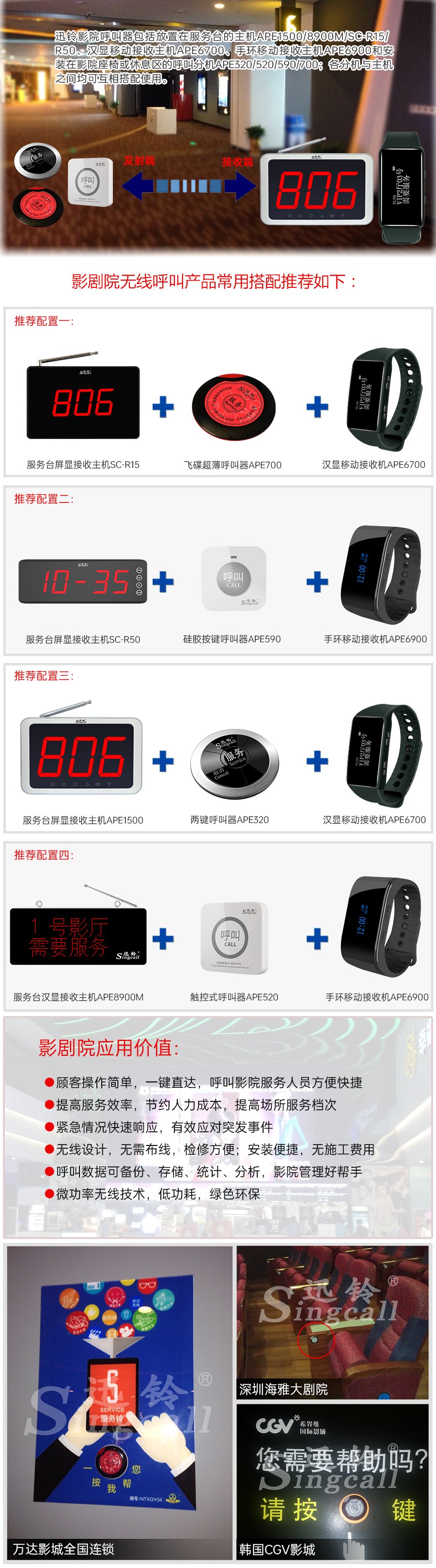 作用用途:影院顧客一鍵呼叫服務(wù)人員提供飲料、咨詢等服務(wù)