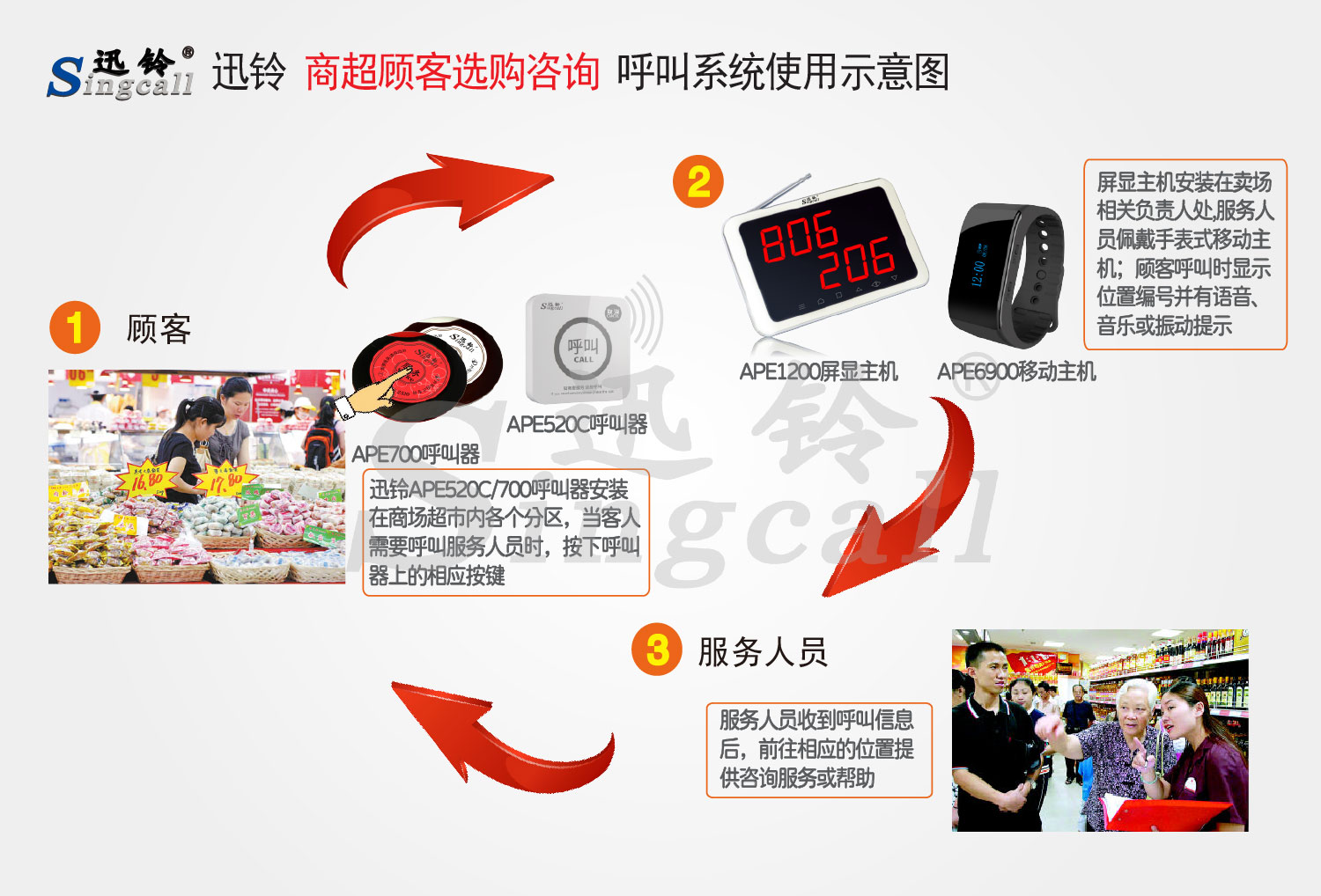 在商場(chǎng)超市內(nèi)各個(gè)分區(qū)適當(dāng)位置分別安裝一個(gè)或者多個(gè)無線呼叫器,賣場(chǎng)相應(yīng)負(fù)責(zé)人處安裝屏顯接收主機(jī)(根據(jù)情況可選配腕式手表移動(dòng)接收主機(jī)),顧客在購買產(chǎn)品,服務(wù)人員離開或者不在現(xiàn)場(chǎng)的情況下,顧客根據(jù)需要選擇按鍵,例如在食品區(qū)選擇安裝多鍵的呼叫器,服務(wù)區(qū)域沒有供客人使用的食品袋,或者對(duì)于產(chǎn)品有異議需要幫助時(shí),顧客可以根據(jù)需要發(fā)出無線呼叫請(qǐng)求,相應(yīng)部門負(fù)責(zé)人配有移動(dòng)/屏顯接收主機(jī),接收信息后迅速做出反映,迅速處理客戶遇到的問題;在生活區(qū),客人選購服裝類產(chǎn)品試穿時(shí)如遇到調(diào)換試穿服裝或者需要其他幫助時(shí),可以輕松按下呼叫器,服務(wù)人員接收主機(jī)端就會(huì)顯示試衣間的房間號(hào),便于迅速判斷幫助解決。