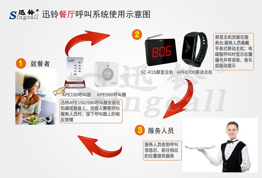 就餐的客人通過按下迅鈴餐桌、包間無線呼叫按鈕的相應(yīng)按鍵呼叫服務(wù)人員,服務(wù)人員可以通過放置在服務(wù)臺、吧臺等地的屏顯接收主機、腕式手表移動接收機、與屏顯主機相連接的對講機接收呼叫信息;服務(wù)員去根據(jù)提示呼叫客人處提供點餐、酒水、結(jié)賬等相關(guān)服務(wù)。同時選配的服務(wù)監(jiān)督考核軟件會有相應(yīng)的呼叫記錄信息,方便管理者進行查看,分析與管理。