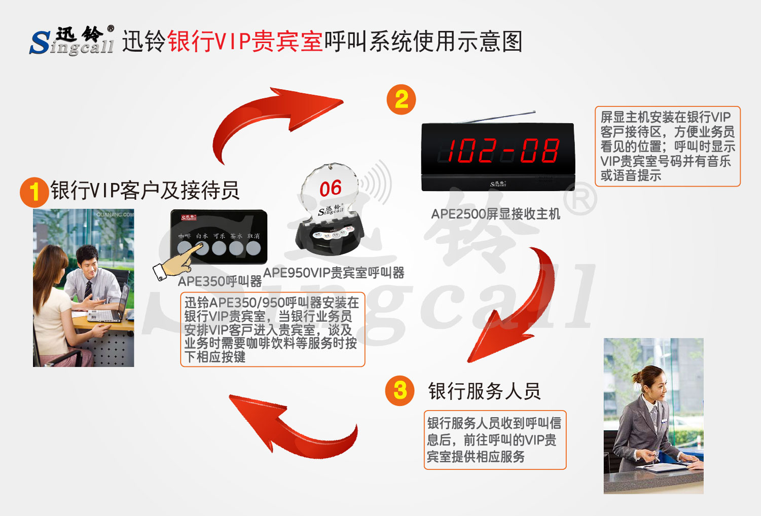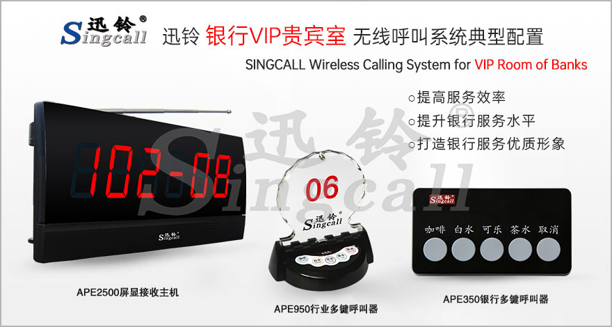 銀行VIP貴賓室呼叫服務(wù)常用推薦產(chǎn)品有APE350/APE950行業(yè)五鍵呼叫器,APE2500屏顯接收主機(jī),更多產(chǎn)品搭配請(qǐng)點(diǎn)擊“