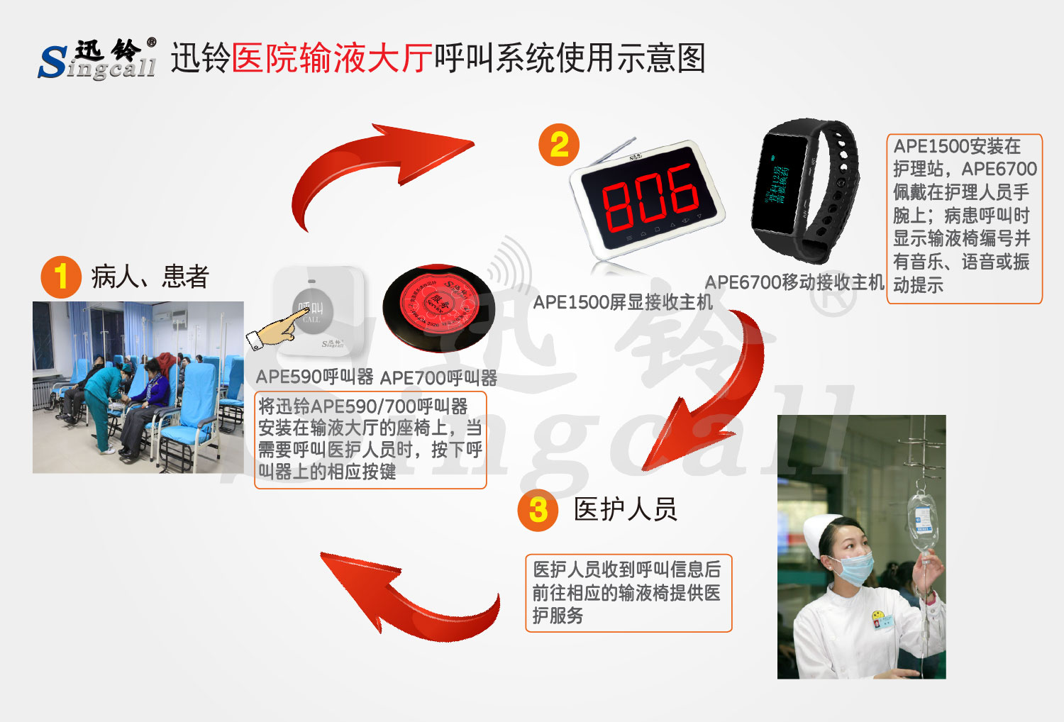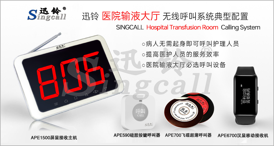 輸液大廳常用的推薦產(chǎn)品有APE1500屏顯接收主機(jī)、APE6700漢顯移動(dòng)接收機(jī)、APE590硅膠按鍵呼叫器、APE700飛碟超薄呼叫器。更多產(chǎn)品選擇請點(diǎn)擊“