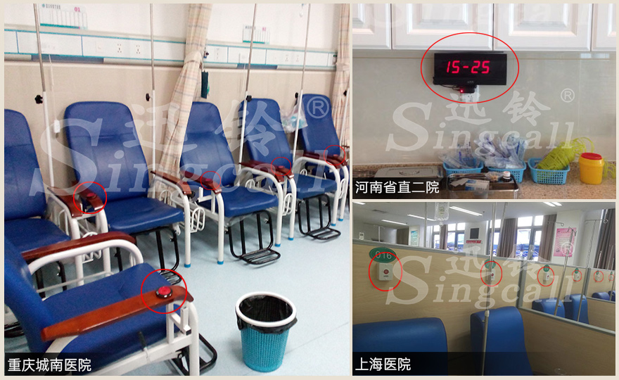 在輸液大廳的座椅上安裝呼叫器,護(hù)理站放置屏顯接收主機(jī),醫(yī)護(hù)人員佩戴手腕接收主機(jī),當(dāng)病人需要換瓶、起針時(shí)按下按鈕,屏顯接收主機(jī)通過語音播報(bào)、號(hào)碼提示,腕式手表接收機(jī)通過鈴聲或者振動(dòng)提示,快速前去輸液處提供相應(yīng)的換藥起針等服務(wù)。