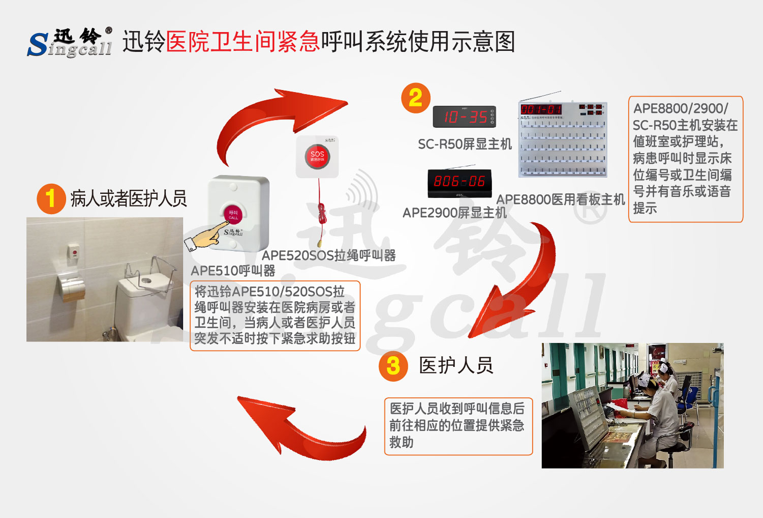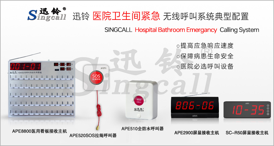 常用的推薦產(chǎn)品有APE8800醫(yī)用看板接收主機、APE2900屏顯接收主機、SC-R50屏顯接收主機、APE510全防水呼叫器、APE520SOS拉繩呼叫器。更多產(chǎn)品選擇請點擊“