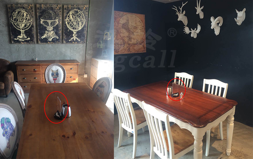 根據(jù)店內(nèi)裝修擺設(shè),APE950臺卡呼叫器放置在每個餐桌上,當(dāng)顧客根據(jù)實(shí)際需要按下相應(yīng)的點(diǎn)單、加水,服務(wù),結(jié)賬,取消五個按鍵時,帶廣告宣傳功能的水晶插板會發(fā)散出炫彩、夢幻的藍(lán)色燈光,美輪美奐。同時,掛于墻壁的屏顯接收主機(jī)APE1500同步接收到呼叫信息,顯示位置編號或者以語音報(bào)號、音樂等方式提醒服務(wù)人員準(zhǔn)確、快速地前去服務(wù),讓顧客在接受健康美味的味蕾享受之時 ,也盡享放松、舒適的休閑環(huán)境。