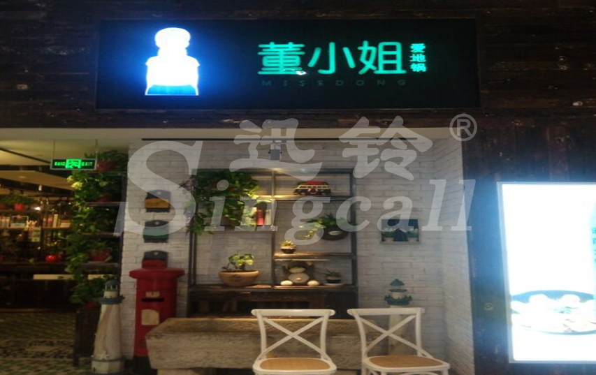 董小姐愛(ài)地鍋,擁有別具一格的中式清新風(fēng)格,原木色主調(diào)配上淡藍(lán)色簾子,各類(lèi)置物架上放著清新綠植和可愛(ài)小物件,還有隱約在耳邊幽幽回轉(zhuǎn)的民謠“董小姐”。小清新,老地鍋,置身于其中,一切都是這樣自然。為了提高服務(wù)質(zhì)量,解決高峰期顧客用餐,工作人員忙不過(guò)來(lái)的實(shí)際問(wèn)題,“董小姐”決定安裝迅鈴無(wú)線(xiàn)呼叫系統(tǒng),用于解決店內(nèi)工作人員可以及時(shí)服務(wù)的問(wèn)題。