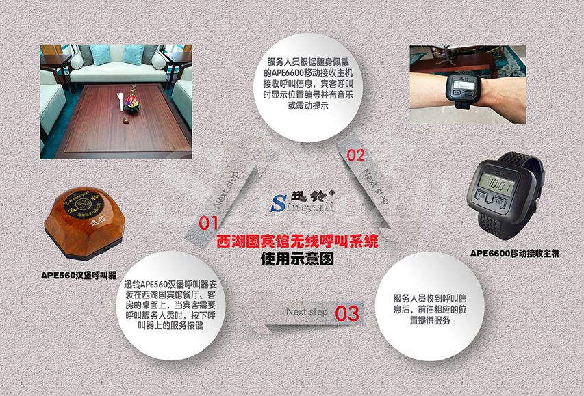 西湖國(guó)賓館安裝的迅鈴無(wú)線呼叫系統(tǒng)包括APE560漢堡呼叫器和APE6600腕式移動(dòng)接收主機(jī)。賓客在不同場(chǎng)所,需要點(diǎn)餐、加水等各種服務(wù)時(shí),都可以按下桌上的APE560漢堡呼叫器呼叫服務(wù)人員。與此同時(shí),服務(wù)人員根據(jù)隨身佩戴的APE6600腕式移動(dòng)接收主機(jī),同步接收賓客的呼叫信息。APE6600顯示呼叫位置編號(hào),并以音樂(lè)或者震動(dòng)等提示方式提醒服務(wù)人員及時(shí)前去服務(wù)。