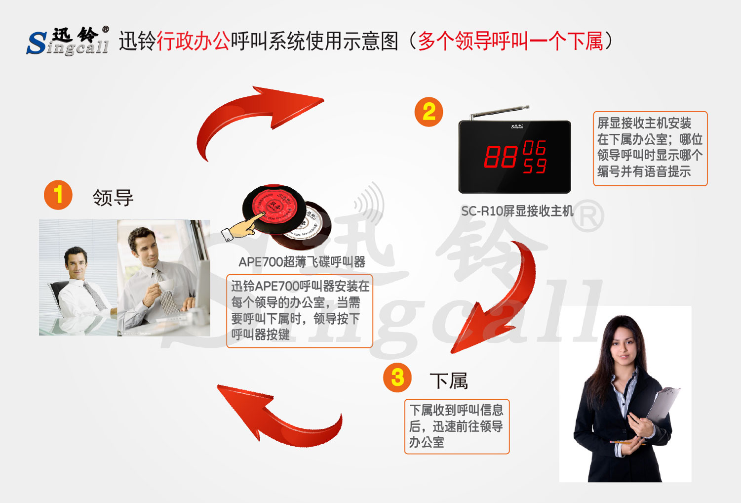 迅鈴無線呼叫器以其方便、快捷的使用和安裝方式,廣泛應用于行政辦公場所。辦公室、會議室、政府機關等場所,內部找人、下達通知和相互溝通是每天都要發(fā)生的事情,尤其是領導找秘書,管理者找下屬等。迅鈴行政辦公無線呼叫系統(tǒng)由領導呼叫器、秘書屏顯接收主機組成。該套系統(tǒng)可以讓領導快速找到下屬,成為辦公室內部領導快速下達指令、有效提高工作效率,改善部門之間配合的必備工具。